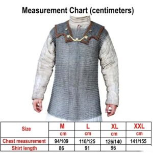 This half haubergeon is intricately HANDMADE from 17 gauge mild steel rings with a diameter of approx. 9 mm each, riveted using DOME RIVETS. For increased strength, the rings alternate with SOLID FLAT RINGS. This half haubergeon is available in three sizes: medium, large and extra-large.