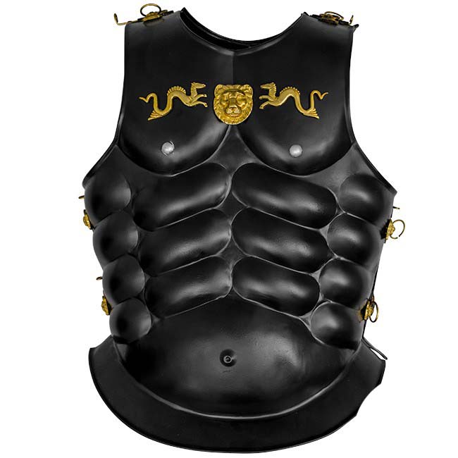 Our classical Greek muscle armour is crafted from 18 gauge steel with a painted black finish and features hinged lynch pin style brass fastenings and decoration. It comes complete with separate decorated leather pteruges (apron). It is great for fancy dress and film/stage work and will fit up to around a 50” chest.