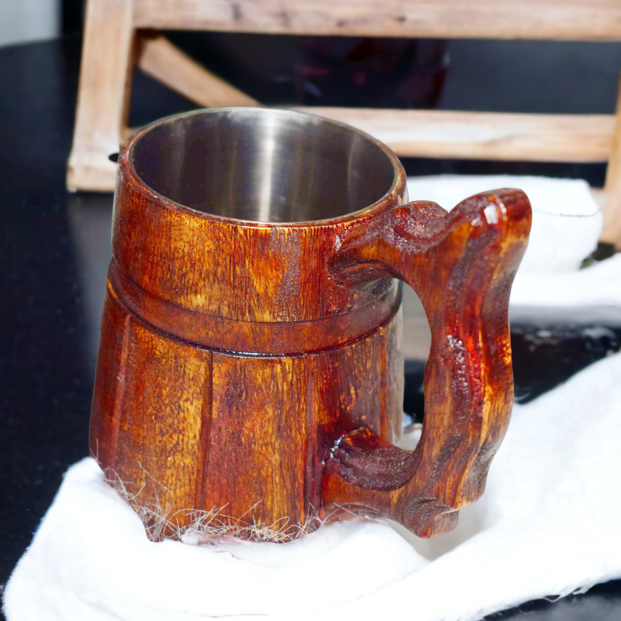 SKU: ICA-LLC-KTC-01 Category: Viking Drinking Horn, Mug & Tankard Tags: durable mugs, handcrafted wooden mugs, hot and cold beverages, insulated drinkware, outdoor adventure mugs, rustic elegance, rustic kitchen accessories, stainless steel interior, unique drinkware., wood and steel mugs